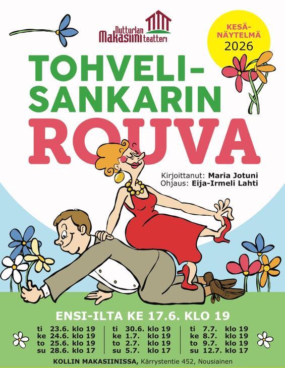 Kesän teatteriretkemme suuntautuu hienoon maalaismaisemaan Nousiaisiin, osoite Kärrystentie 452. Menemme Nutturlan kesäteatteriin katsomaan näytelmää Tohvelisankarin rouva, jonka on kirjoittanut Maria Jotuni. Näytelmän ohjaaja on Eija-Irmeli Lahti.