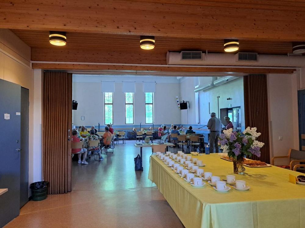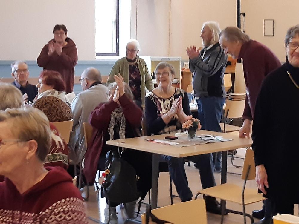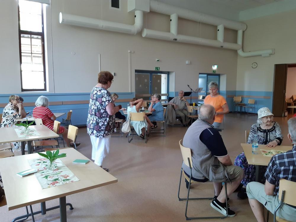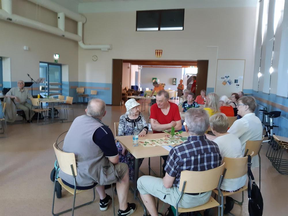 Kevään 2024 viimeinen tiistaikerho oli 28.5. Vetovuorossa oli lauluryhmä. Kuten arvata saattaa se sisälsi paljon laulua ja soittoa. Päivi Korvensyrjä säesti kitaralla, lauloi ja lisäksi myös lausui pari runoa. Pöydillä oli kieloja ja syreeneitä. Tunnelma oli leppoisa. Mukaan oli tullut myös Annikki Oikelmus poikansa kanssa. Annikki taitaa olla kerhomme vanhin jäsen.