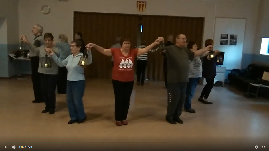 Tiina kuvasi tanssiharjoituksen, joten Heikki joutui harjoittelemaan tässä ilman paria. Joulujuhlassa kaikilla oli pari ja tontuilla tonttuvaatteet tiukuineen päällä.