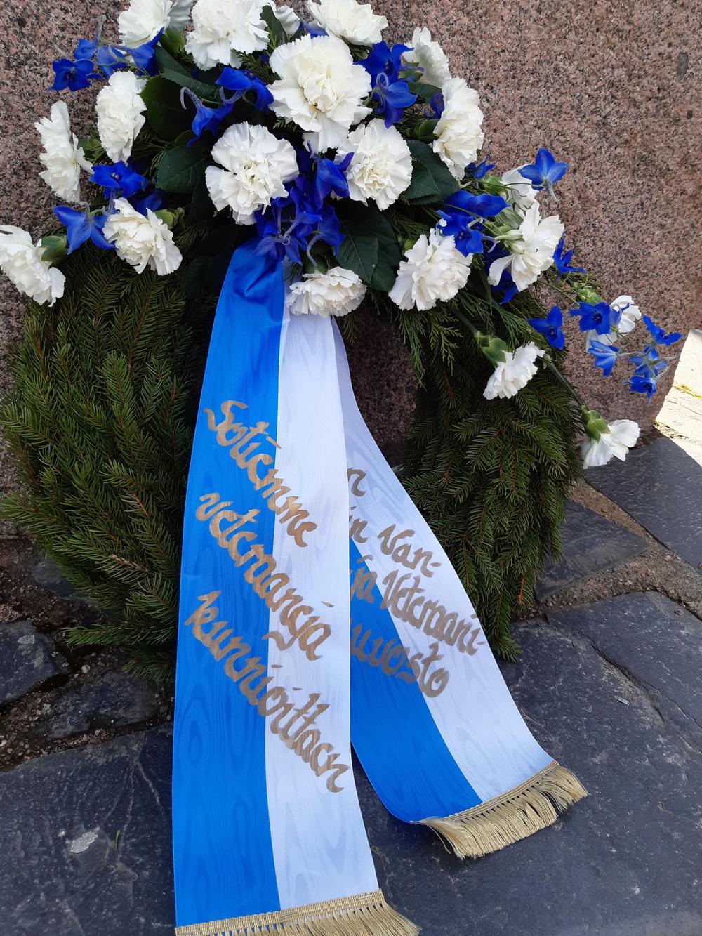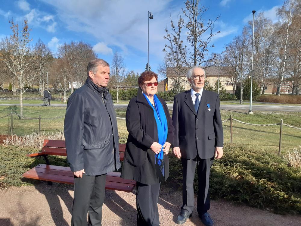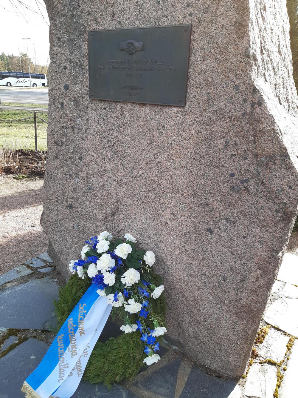 Riitta-Liisa Lehtonen ja Jouko Aalto laskivat Vanhus- ja Veteraanineuvoston edustajina Kaarinan kaupungin seppeleen Piikkiön Veteraanikivelle Kansallisena Veteraanipäivänä 27.4.2023