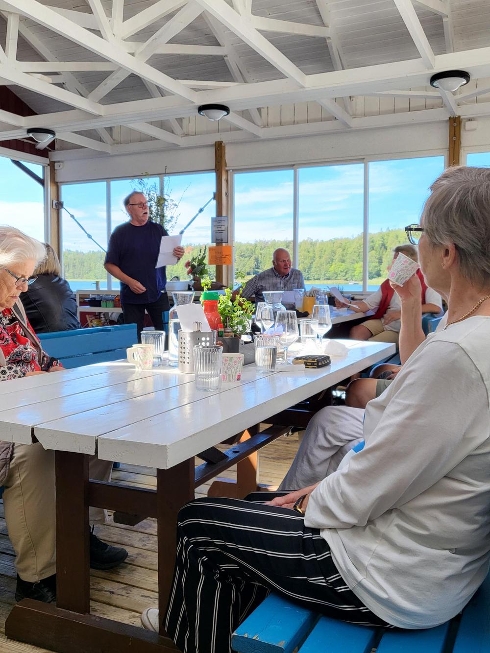 Lauluhetki lounaan jälkeen. Esilaulajina matkaopas Magnus, kuljettaja ja Harry "En sjöman älskar havets våg" soi kauniisti
